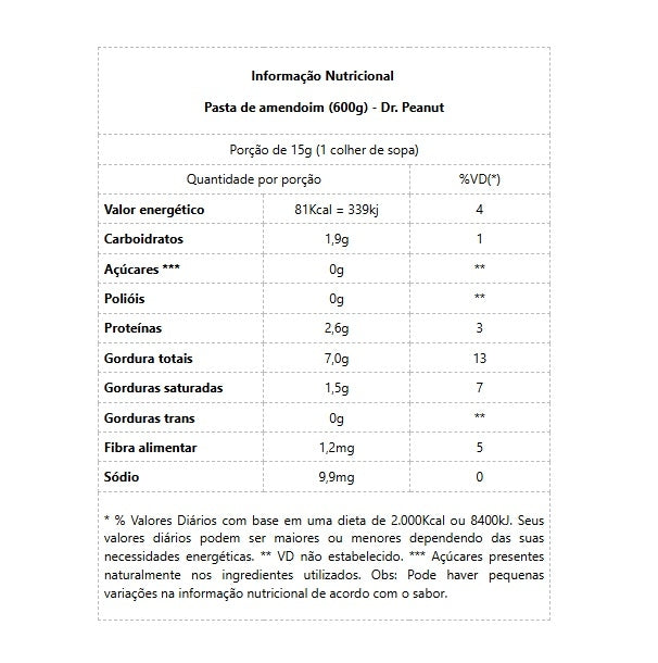 Pasta de Amendoim (600g) - Dr. Peanut       A Pasta de Amendoim da Dr. Peanut agora é nova fórmula, mais cremosa!! E continua sendo a melhor maneira de consumir proteína na dieta de um jeito muito saboroso e mais saudável.    A pasta de amendoim fornece energia de longa duração, é rica em gordura saudável e mantém a saciedade por mais tempo. Ela contém em sua formulação 25% de proteína ISOLADA. E ainda é adoçada com xilitol.     A Pasta de Amendoim da Dr. Peanut é um alimento rico em gordura monoinsaturada, aquela gordura “boa”, e fitosteróis que ajudam no combate do colesterol. Além disso, é um antioxidante natural, de baixo carboidrato, integral, zero glúten, zero gordura trans e zero açúcar. Como ela é uma excelente fonte de gordura e proteínas, pode ser utilizada em dietas que visam a perda de peso ou ganho de massa muscular.      Além de todos esses benefícios, a Pasta de Amendoim Dr. Peanut é adoçada com xilitol e feita com ingredientes de alta qualidade, garantindo um sabor incrível!        Pode comer na tapioca, no shake, com fruta e até de colher! Benefícios: * Apresenta 25% de proteína por porção;* Com Whey Protein;* Baixo carboidrato e sódio;* Fonte de Ômega 3 e 6;* Zero glúten e gordura trans;* Adoçado com xilitol natural;* Saboroso.